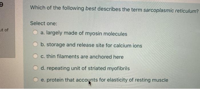 Solved Nhich Of The Following Best Describes The Sarcoplasmic Reticulum Select One Protein That Accounts For The Elasticity Of A Resting Muscle Repeating Unit Of Striated Myofibrils 0 Storage And Release Site